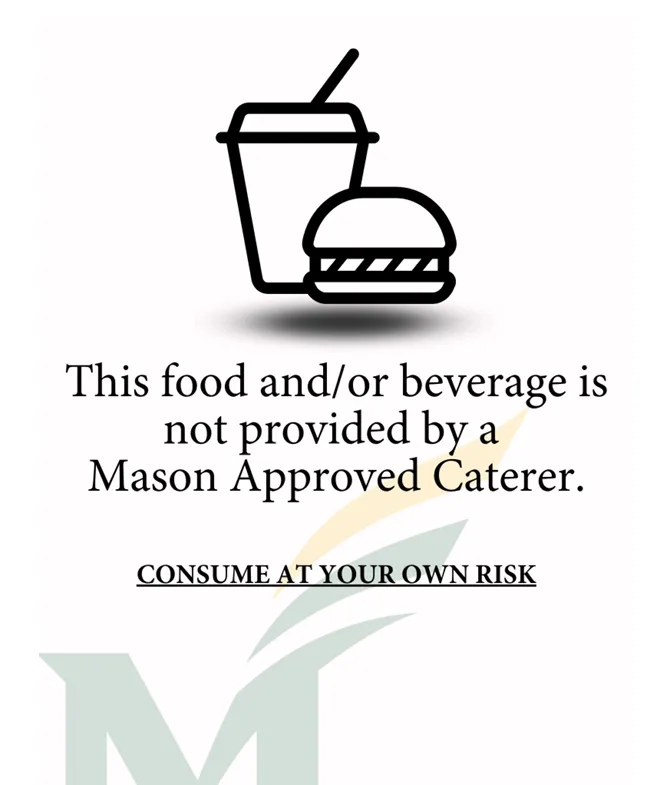 - External vendors intending to sell or distribute food must be on the Approved Caterer List and follow George Mason’s Food Safety for Events and Activities Procedures and Guidelines.